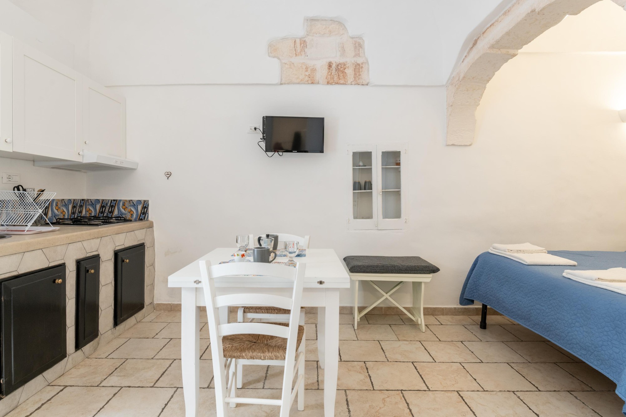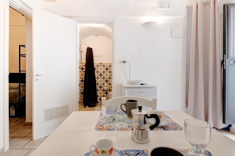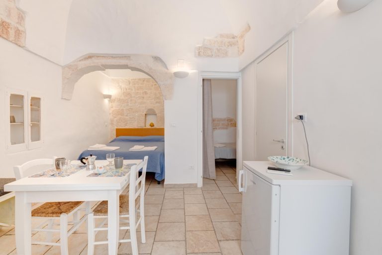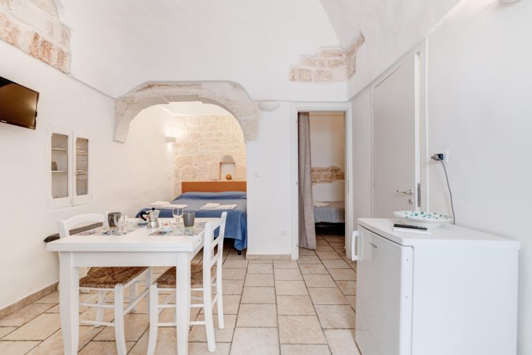 With exposed stone, with the characteristic domed vault, Whitedoorhouse offers a living room with a single bedroom, a bathroom with shower and an equipped kitchenette, an alcove with a double bed.